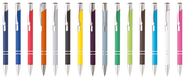 Hliníková propiska se stříbrnými doplňky a měkkým pogumovaným soft povrchem ve fialové barvě. Modře píšící.