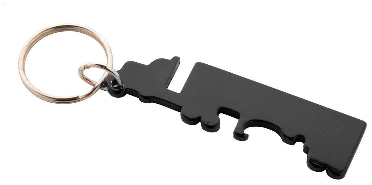 Hliníkový přívěšek na klíče ve tvaru kamionu s funkcí otvíráku na láhve.