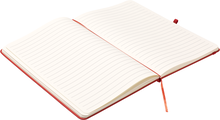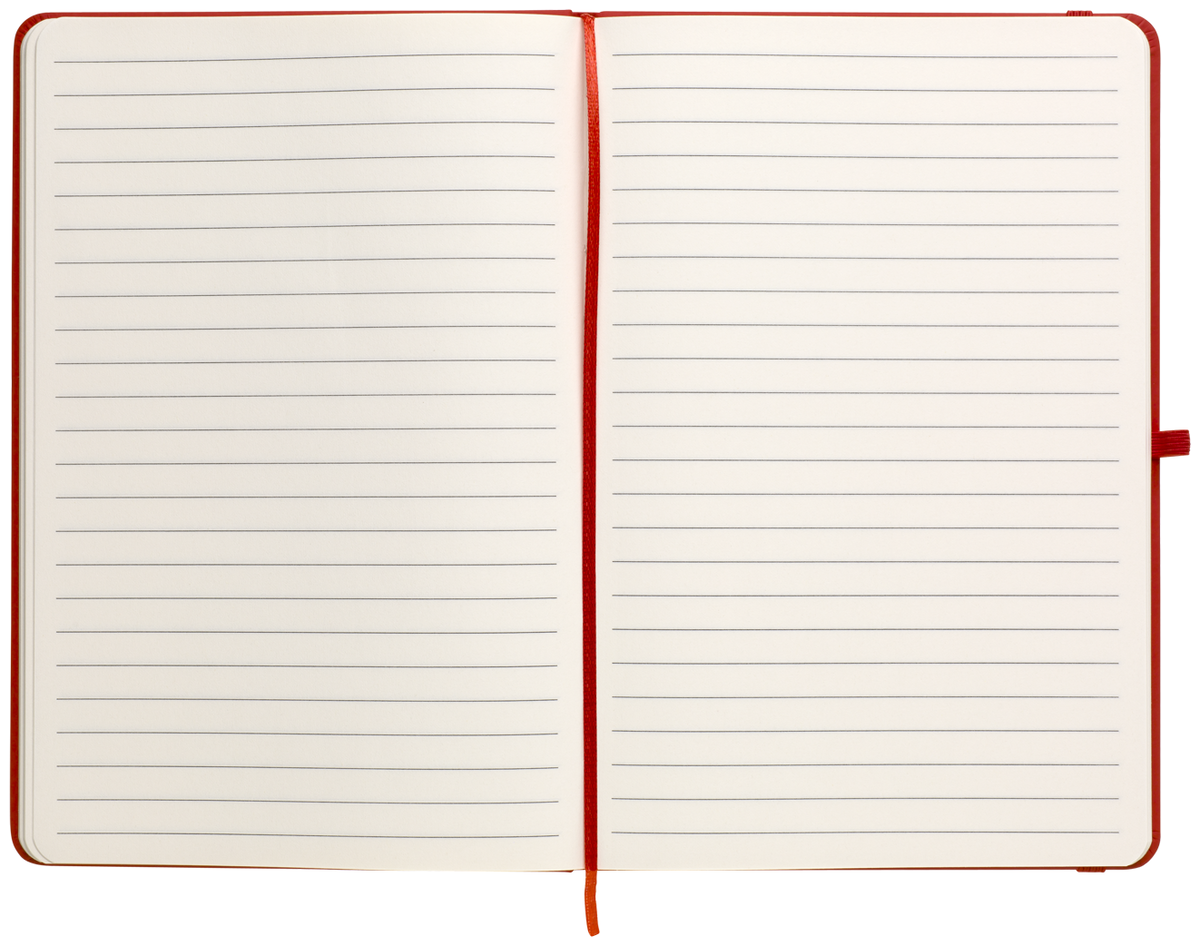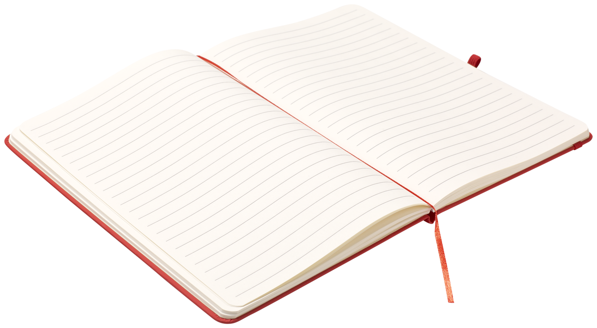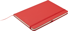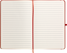 Zápisník A5 v červených deskách z PU materiálu má 80 linkovaných listů. Blok má uzavírací gumičku, poutko na propisku a textilní záložku v barvě desek.