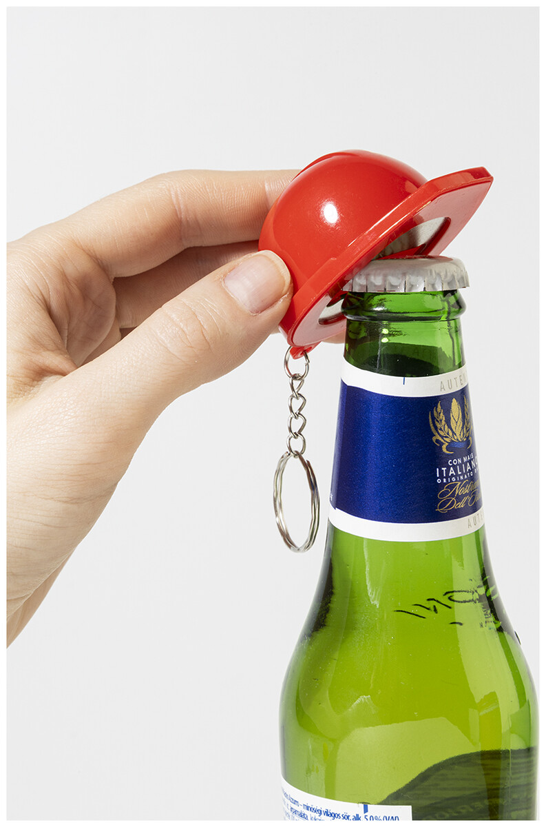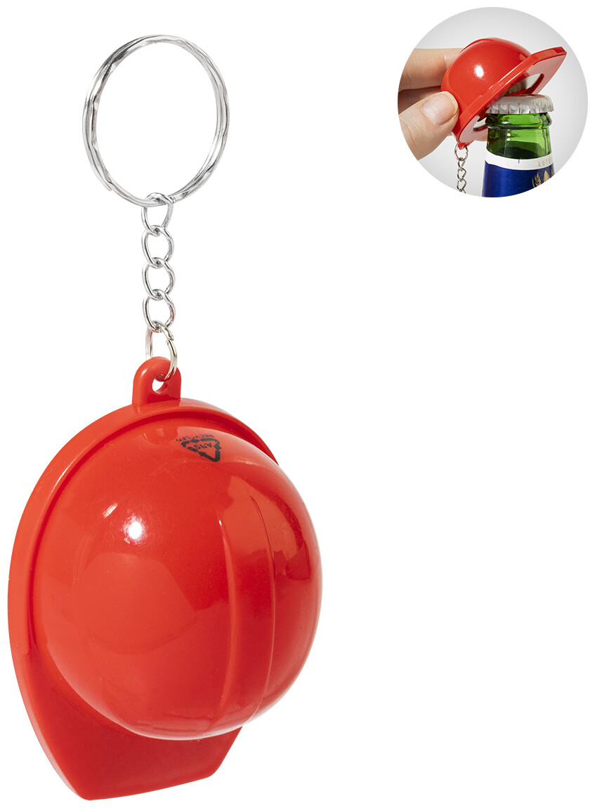 Přívěsek na klíče ve tvaru bezpečnostní přilby z recyklovaného ABS materiálu s otvírákem na lahve.