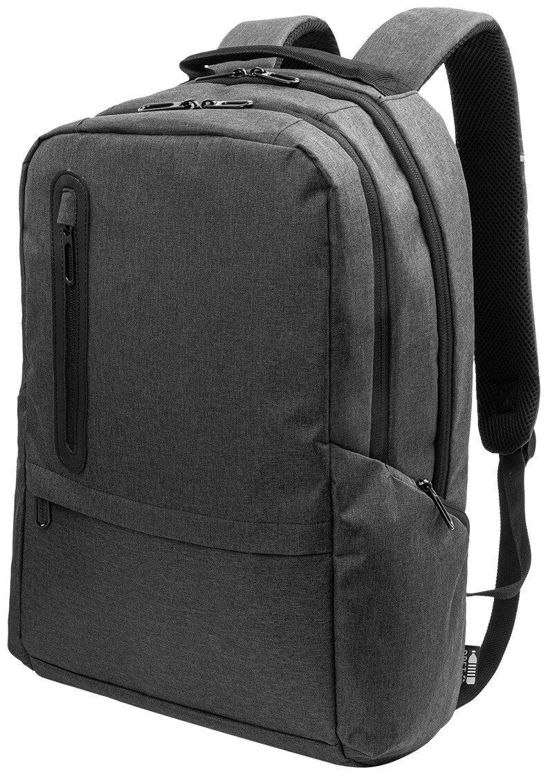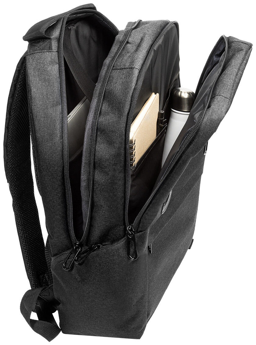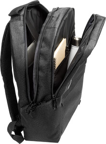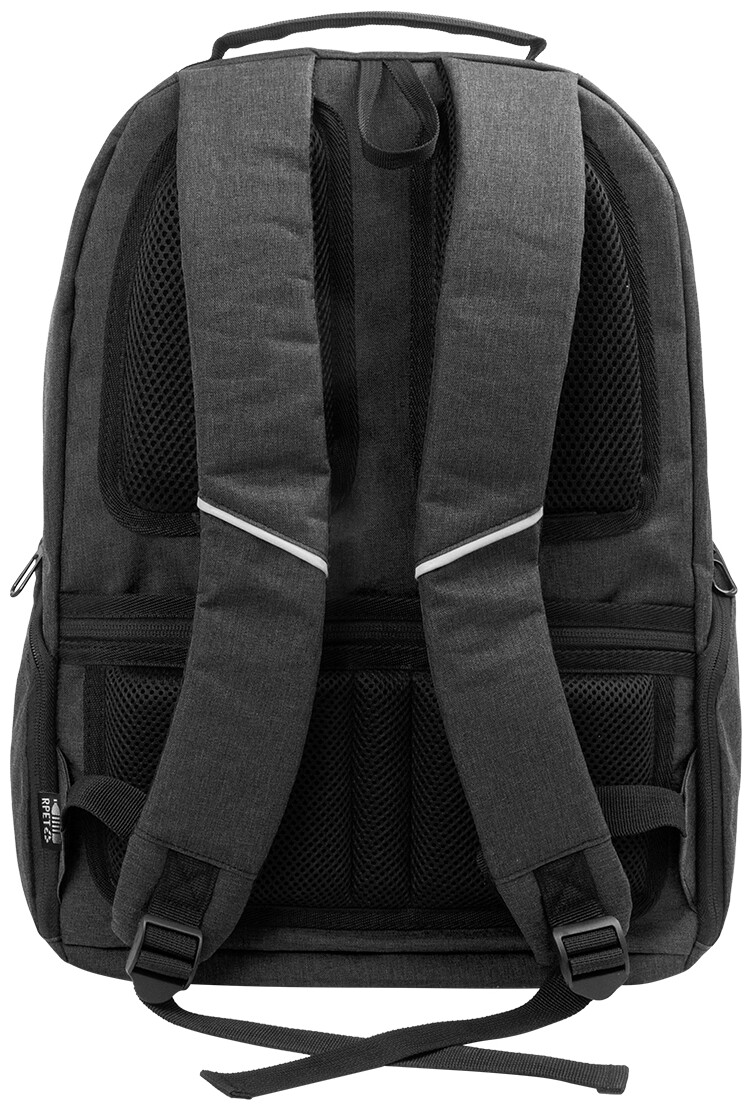 Batoh z RPET s přihrádkami na zip, 2 předními kapsami na zip, bočními kapsami na zip a polstrovanou přihrádkou na notebook (15"). S polstrovanými zády a ramenními popruhy, kapsou s ochranou proti krádeži a popruhem na kufr. Z polyesteru 300D RPET s výrazným štítkem RPET.
