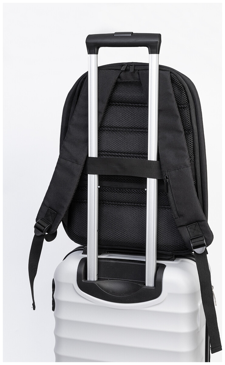 Batoh z RPET s ochranou proti krádeži s přihrádkou na zip, polstrovanou přihrádkou na notebook (15") a tablet (12"), popruhem na kufr, polstrovanými zády a ramenními popruhy. Se skrytou kapsou proti krádeži. Polyester 300D RPET. S výrazným štítkem RPET.