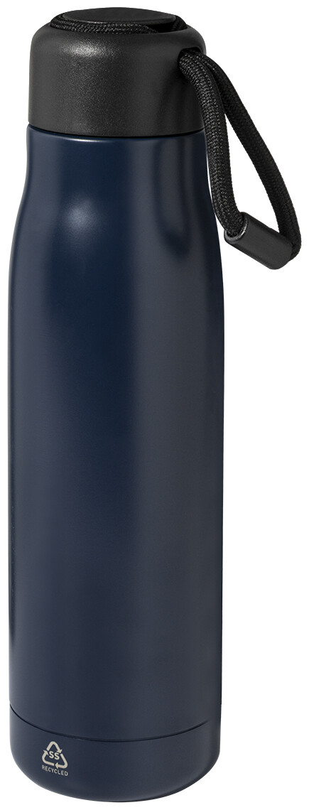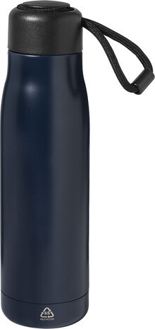 Dvoustěnná, vakuově izolovaná láhev z recyklované nerezové oceli s PP víčkem a integrovaným poutkem na nošení se šňůrkou. 500 ml.