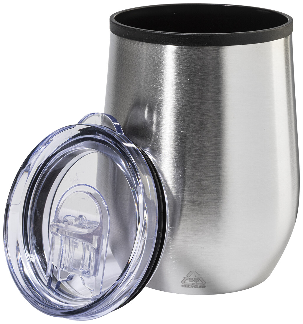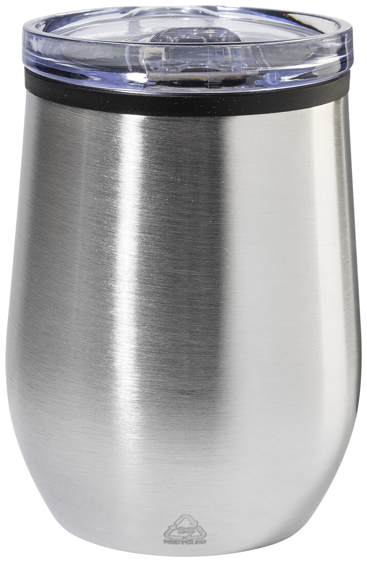 Dvoustěnný termo hrnek z recyklované nerezové oceli s vnitřní stranou z PP a víčkem z PS. 350 ml.