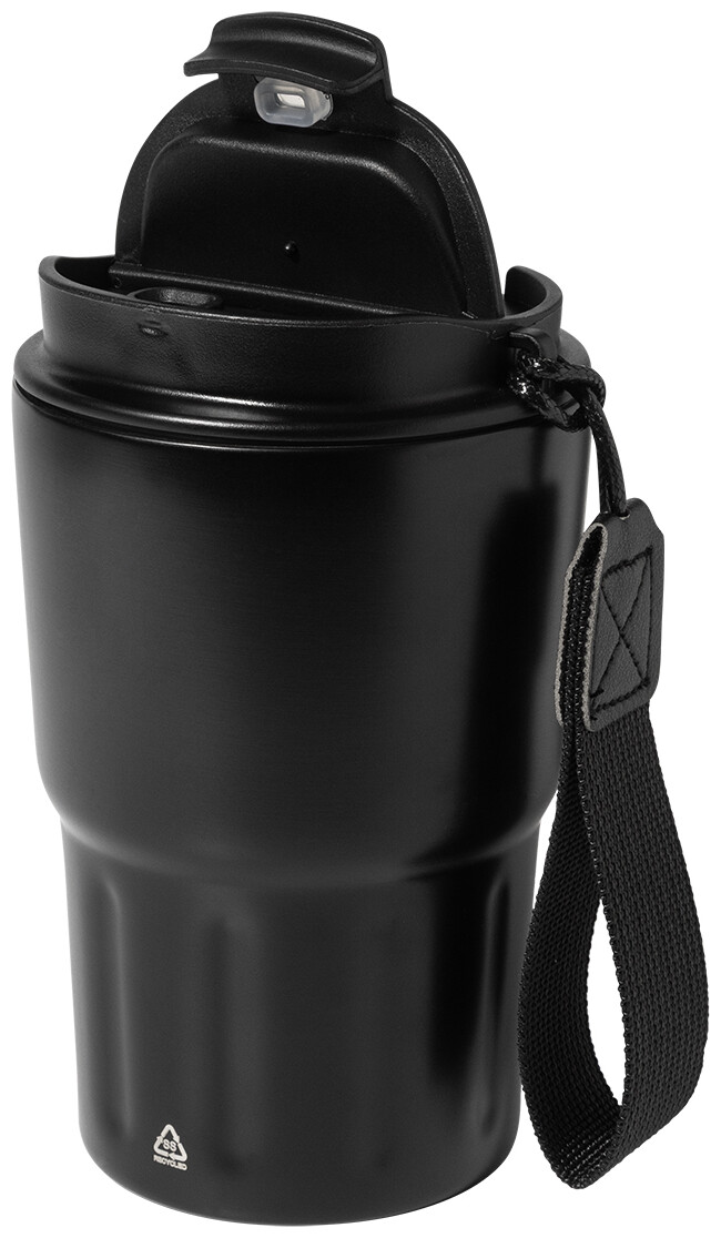 Dvoustěnný termo hrnek z recyklované nerezové oceli s izolačním víčkem z PP. S poutkem z RPET polyesteru. 350 ml.