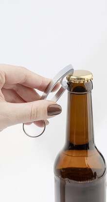 Otvírák na lahve z recyklovaného hliníku s kovovým kroužkem na klíče.