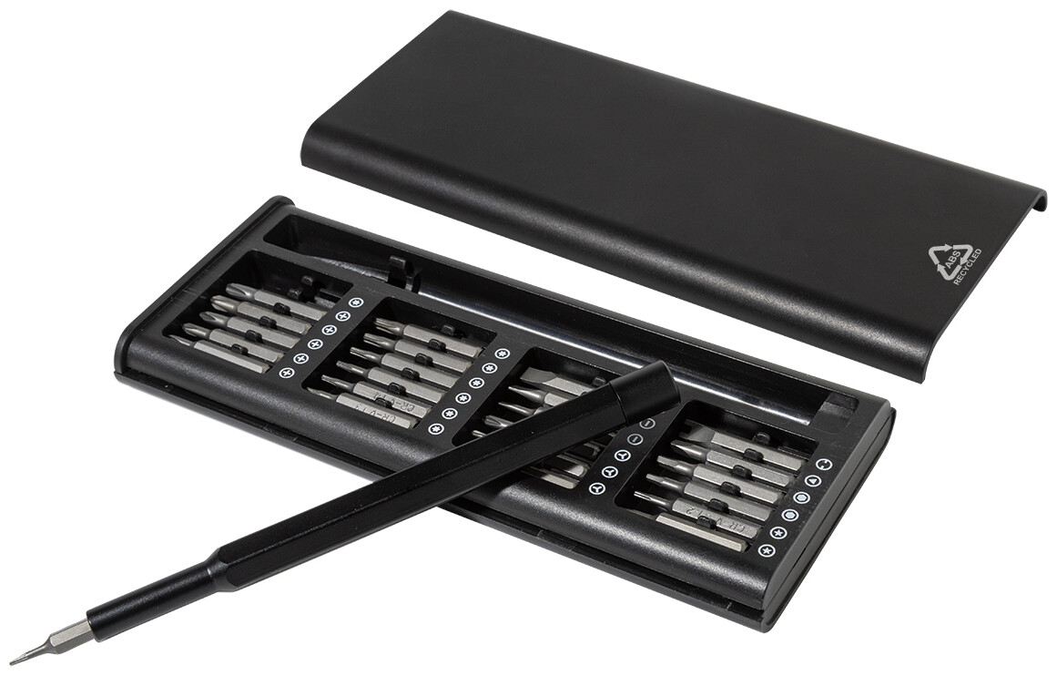 Sada přesných šroubováků s 24 bity v pouzdře z recyklovaného ABS plastu. Rukojeť šroubováku je vybavena magnetickým uchycením bitů pro rychlou a bezpečnou výměnu bitů.