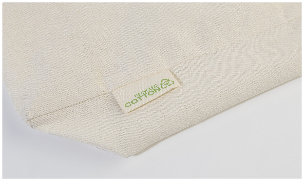 Nákupní taška s klínkem a dlouhými uchy ze 70 % recyklované bavlny a 30 % RPET polyesteru, 140 g/m2. S výraznou etiketou o recyklované bavlně.