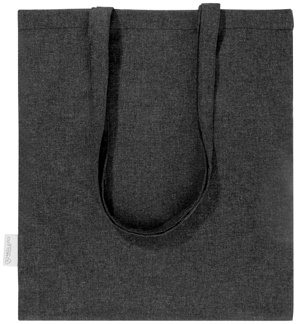 Nákupní taška s dlouhými uchy ze 70 % recyklované bavlny a 30 % RPET polyesteru, 140 g/m2. S výraznou etiketou o recyklované bavlně.