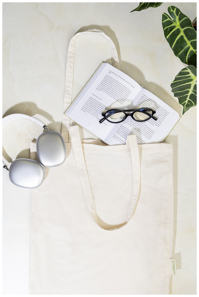 Nákupní taška s dlouhými uchy ze 70 % recyklované bavlny a 30 % RPET polyesteru, 140 g/m2. S výraznou etiketou orecyklované bavlně.