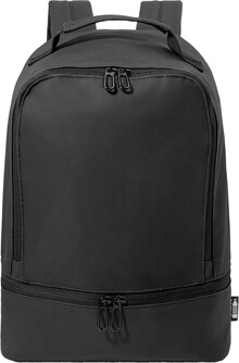 Voděodolný batoh z RPET s hlavní přihrádkou na zip, polstrovanou přihrádkou na notebook (13"), spodní přihrádkou na zip a skrytou boční kapsou. S polstrovanými zády a ramenními popruhy. Polyester 600D RPET s PU zátěrem a výrazným štítkem RPET.