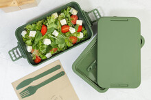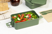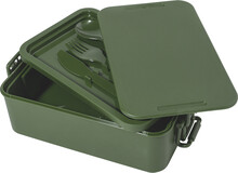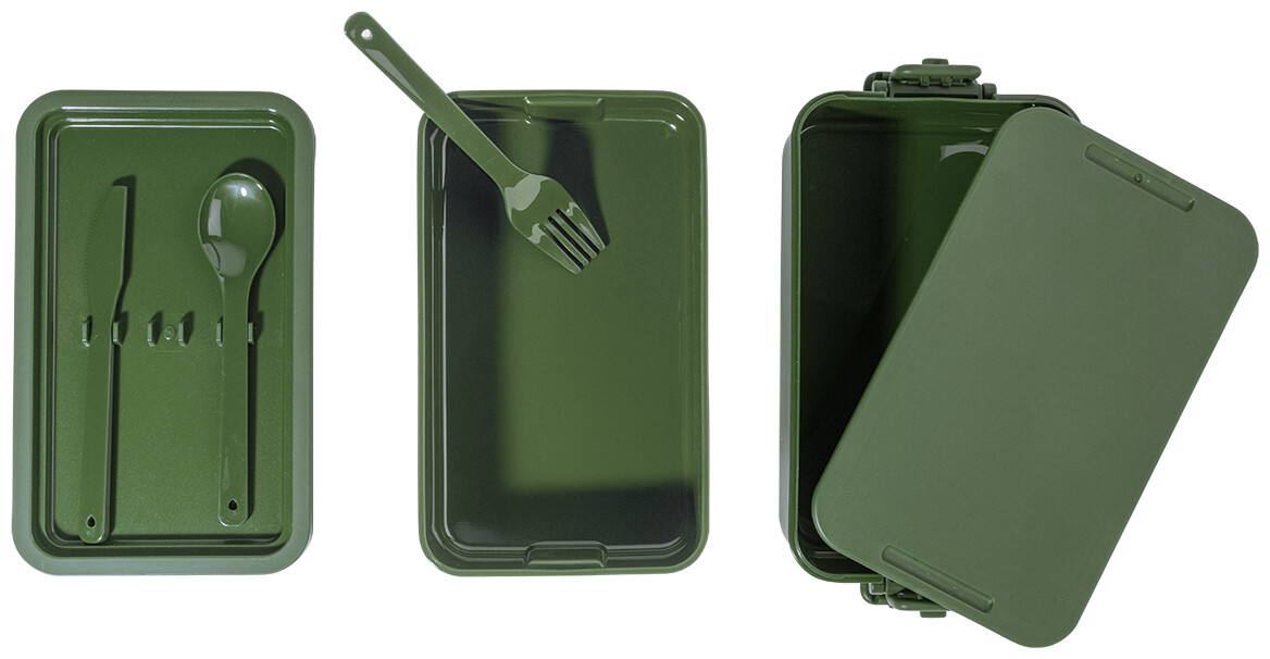 Box na jídlo z PP plastu se sadou příborů (vidlička, lžíce a nůž), zapínáním na přezku a 2 přihrádkami (1000 ml a 800 ml). Stohovatelný design pro kompaktní skladování.