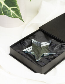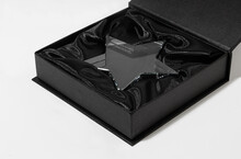 Skleněná trofej ve tvaru hvězdy v černé dárkové krabičce.