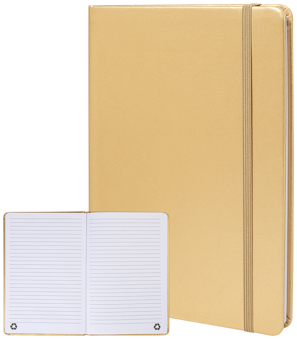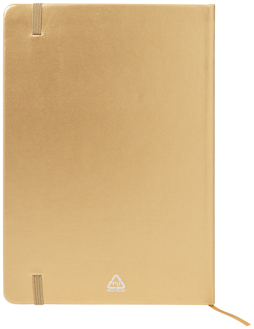 Blok A5 s potahem z recyklované PU kůže s metalickou úpravou se 100 linkovanými listy z recyklovaného papíru. S barevnou záložkou a gumičkou.