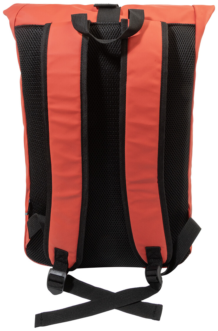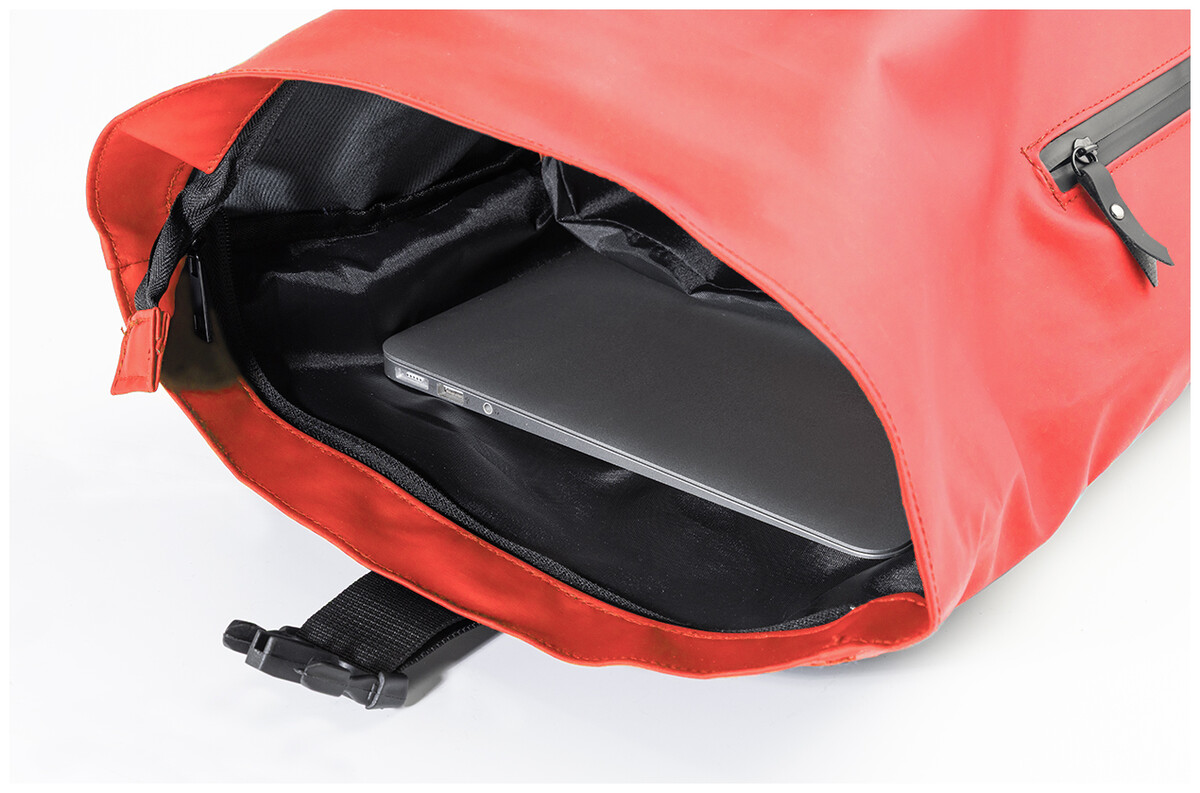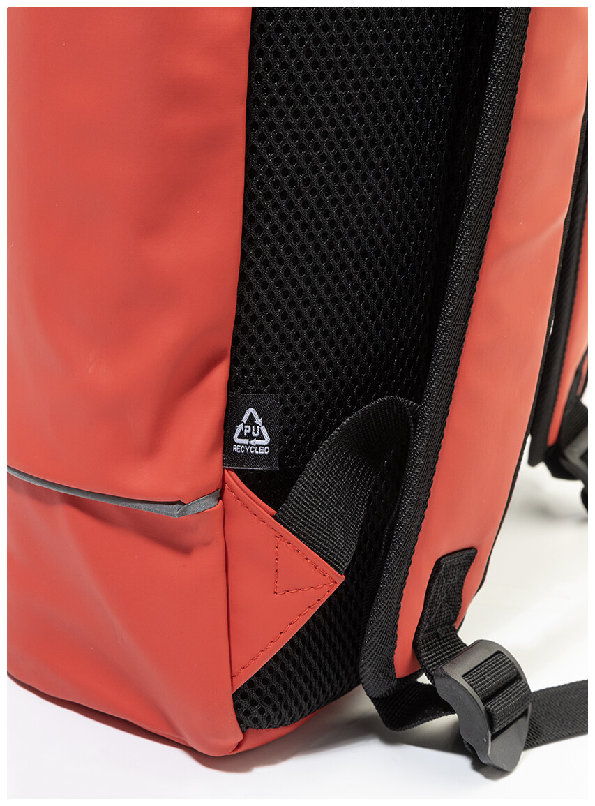 Voděodolný batoh s rolovacím vrškem z měkké recyklované PU kůže s hlavní přihrádkou na zip a zapínáním na přezku, přední kapsou s voděodolným zipem, polstrovanou přihrádkou na notebook (15") a reflexním proužkem. S polstrovanými zády a ramenními popruhy. S výraznou nálepkou z recyklované PU kůže. Pouze pro propagační účely, se produkt nekvalifikuje jako osobní ochranný prostředek.