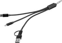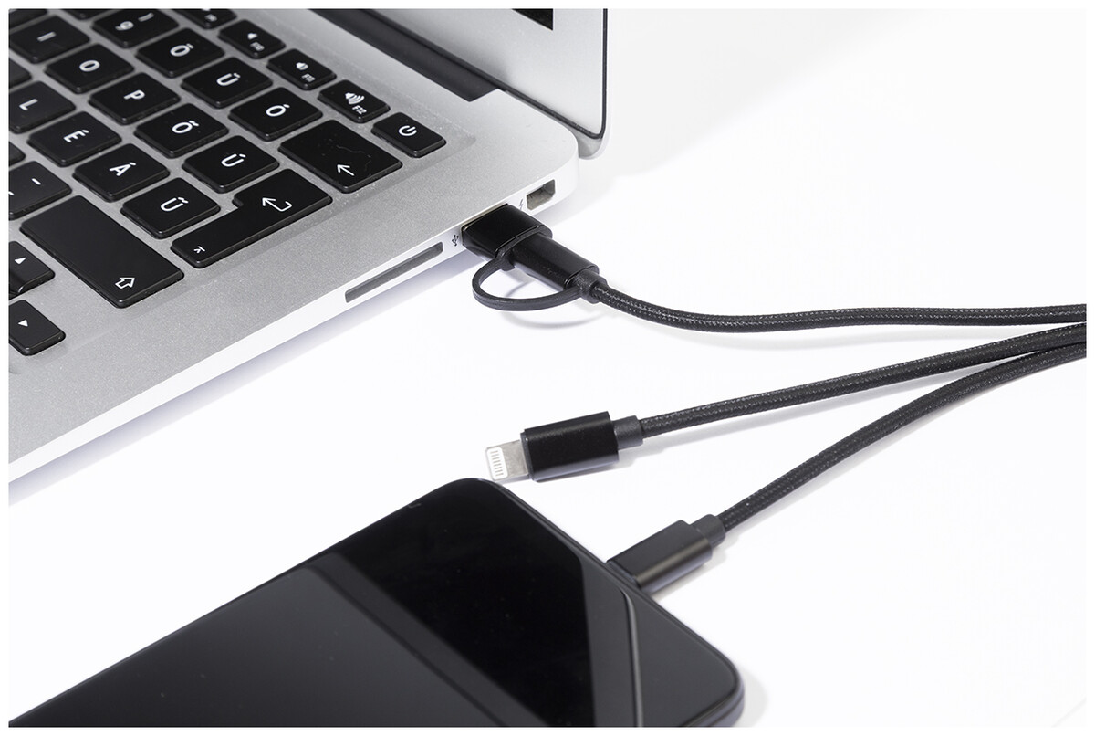 Nabíjecí kabel USB-C z recyklovaného hliníku a RPET s přívěskem na klíče. S konektory micro USB, USB-C a Lightning. S USB a USB-C vstupy.