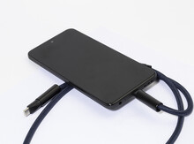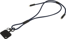 Šňůrka s držákem na mobil z RPET s vložkou pro telefon, karabinou a integrovaným nabíjecím kabelem USB-C na USB-C se skrytými konektory. Podporuje rychlé nabíjení a přenos dat PD 60W.