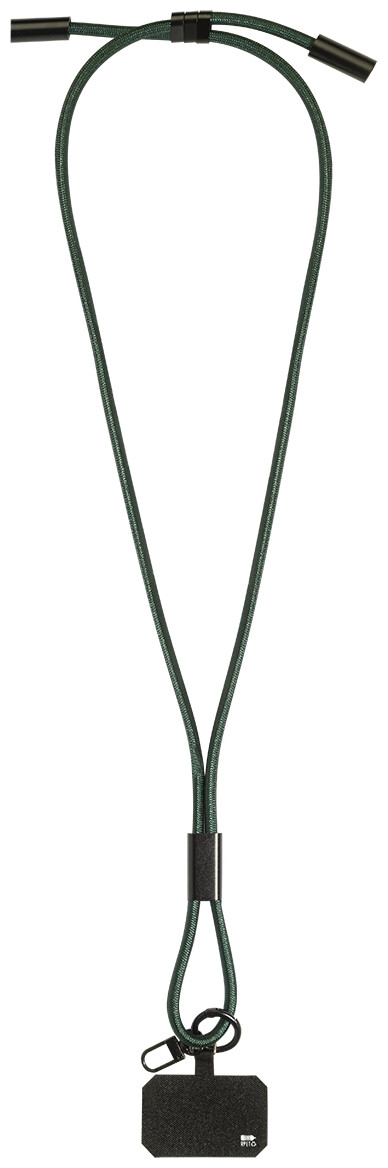 Šňůrka s držákem na mobil z RPET s vložkou pro telefon, karabinou a integrovaným nabíjecím kabelem USB-C na USB-C se skrytými konektory. Podporuje rychlé nabíjení a přenos dat PD 60W.