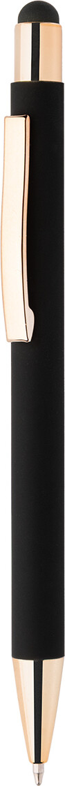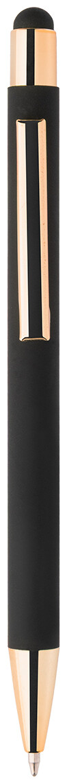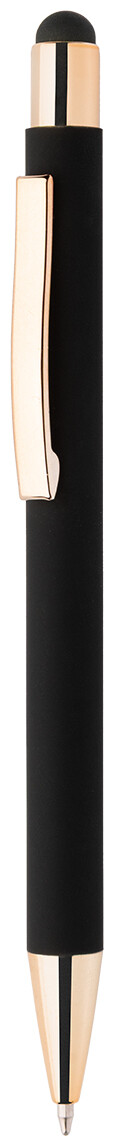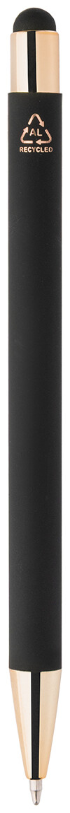 Kuličkové pero z recyklovaného hliníku na dotykovou obrazovku, s černým pogumovaným tělem a barevnými lesklými kovovými částmi. Se speciálním povrchem pro zrcadlové gravírování, které ladí s kovovými částmi. S modrou náplní.