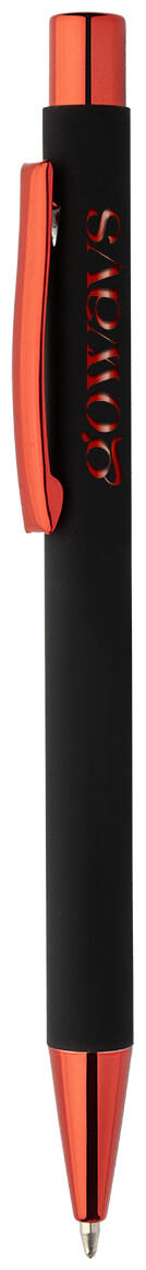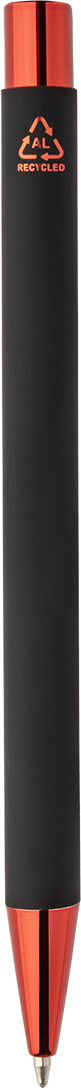 Kuličkové pero z recyklovaného hliníku s černým pogumovaným tělem a barevnými lesklými kovovými částmi. Se speciálním povrchem pro zrcadlové gravírování, které ladí s kovovými částmi. S modrou náplní.