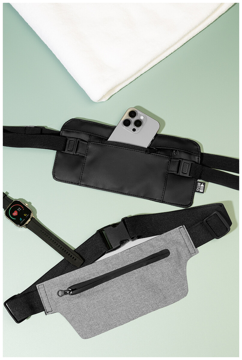 Úzká ledvinka z RPET s přihrádkou na zip a nastavitelným elastickým popruhem. 300D RPET polyester s charakteristickým štítkem RPET.