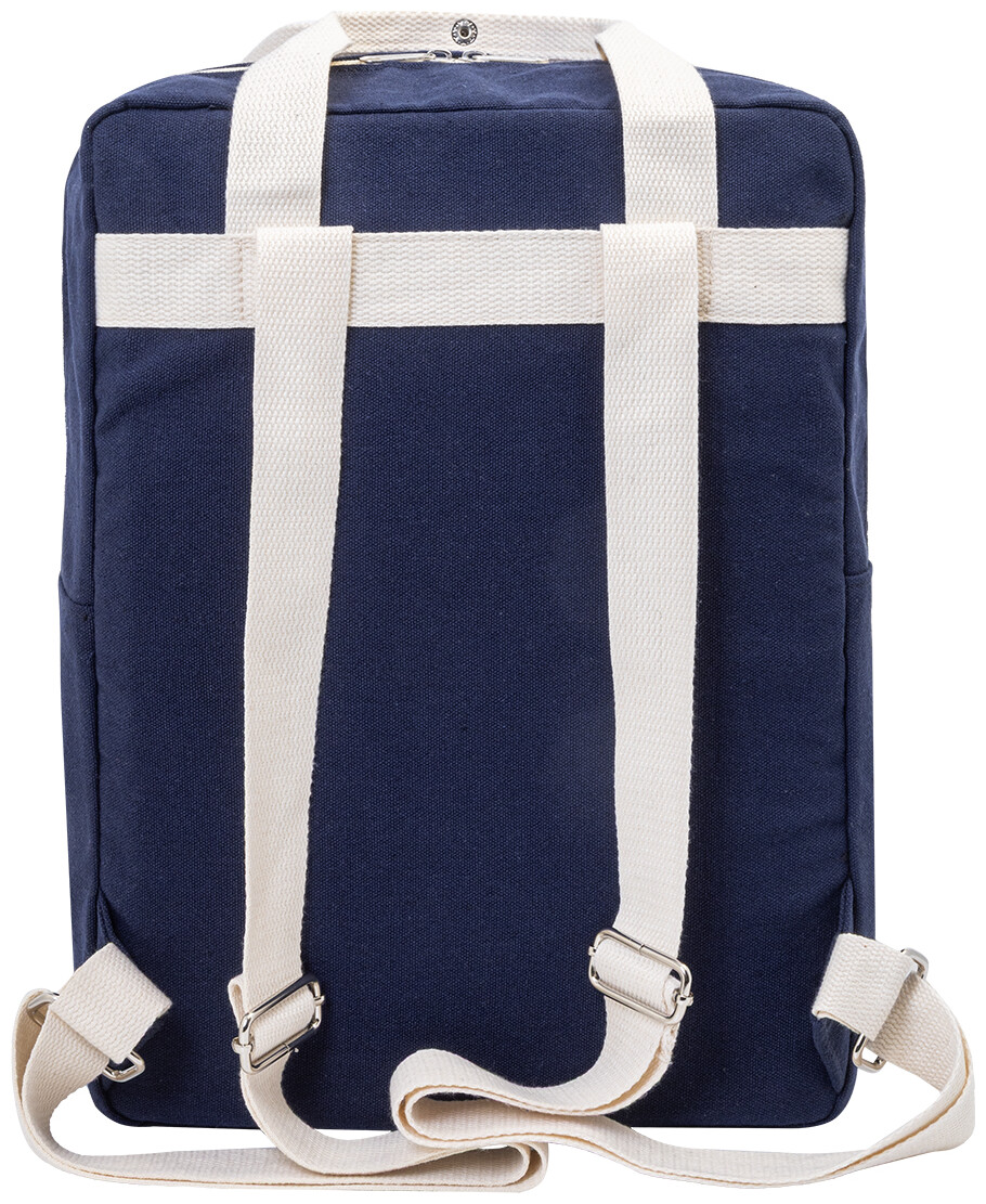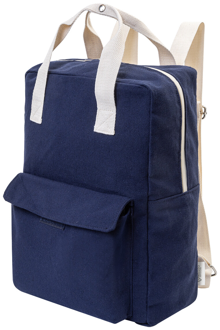 Batoh z recyklovaného plátna s hlavní přihrádkou na zip, polstrovanou přihrádkou na notebook (13") a přední kapsou na suchý zip. 70 % recyklované bavlny a 30 % RPET polyesteru. S výraznou etiketou o recyklované bavlně.