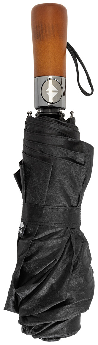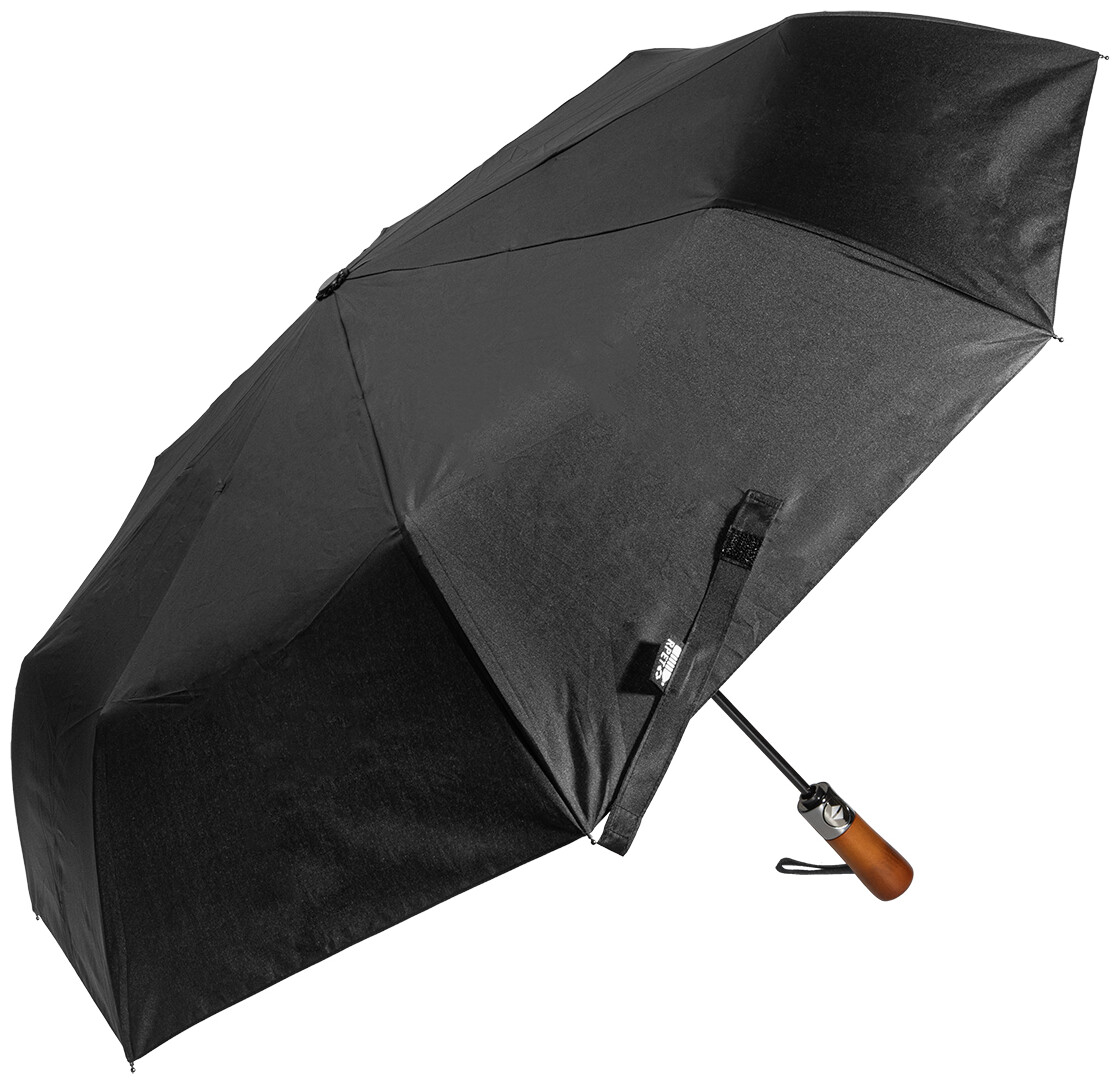 Velký, plně automatický (otevřít/zavřít) větruodolný skládací deštník s 8 panely a elegantní dřevěnou rukojetí s poutkem na ruku. S kovovým rámem a žebry ze skelných vláken. 190T RPET pongee. S charakteristickým RPET štítkem.