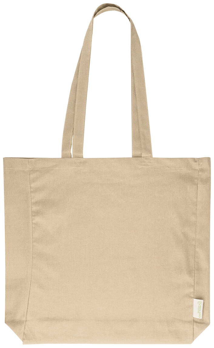 Nákupní taška s klínkem a dlouhými uchy ze 70 % recyklované bavlny a 30 % RPET polyesteru, 140 g/m2. S výraznou etiketou o recyklované bavlně.