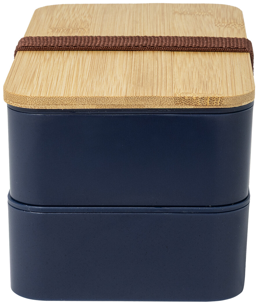 Box na jídlo z PP plastu se sadou příborů (vidlička, lžíce a nůž), bambusovým víkem a elastickým popruhem. Se 2 přihrádkami o objemu 700 ml.