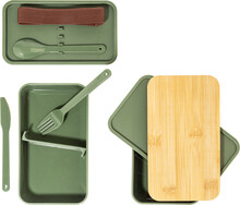 Box na jídlo z PP plastu se sadou příborů (vidlička, lžíce a nůž), bambusovým víkem a elastickým popruhem. Se 2 přihrádkami o objemu 700 ml.