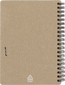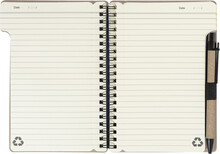 Spirálový blok A6 z recyklovaného papíru s 80 linkovanými listy. Včetně recyklovaného papíru a kuličkového pera z recyklovaného PP s modrou náplní.