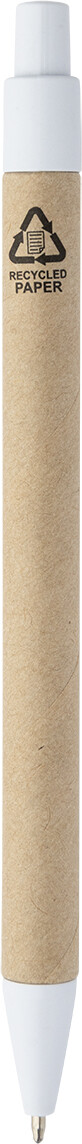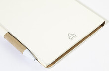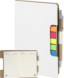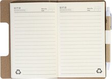 Blok s recyklovanou PU kůží, 70 linkovanými listy z recyklovaného papíru a 125 značkovači stránek (v 5 různých barvách). Včetně recyklovaného papíru a kuličkového pera z recyklovaného PP s modrou náplní.
