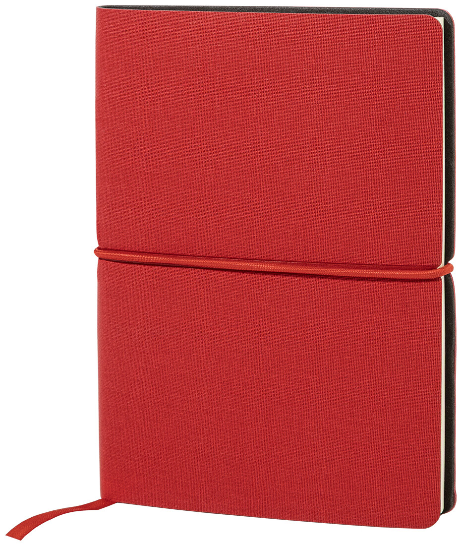 Blok A6 s recyklovanou PU kůží, 70 linkovanými listy z recyklovaného papíru, 25 samolepicími papírky a 125 značkovači stránek (v 5 různých barvách). Se záložkou a horizontálním gumovým páskem.