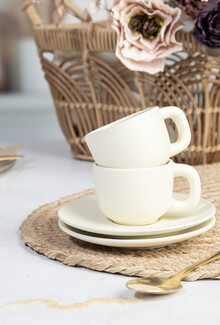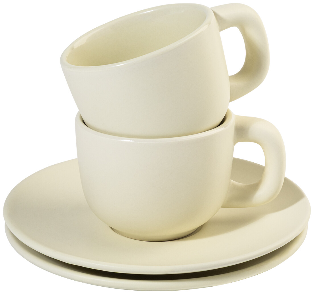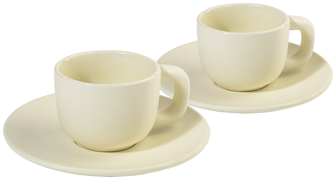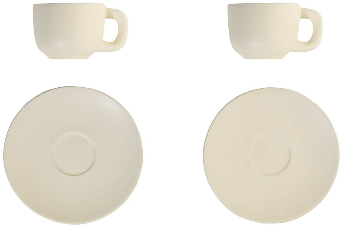Vysoce kvalitní sada keramických šálků na espresso se 2 šálky a podšálky. S matnou vnější a lesklou vnitřní povrchovou úpravou. 85 ml. V kraftové papírové krabici.