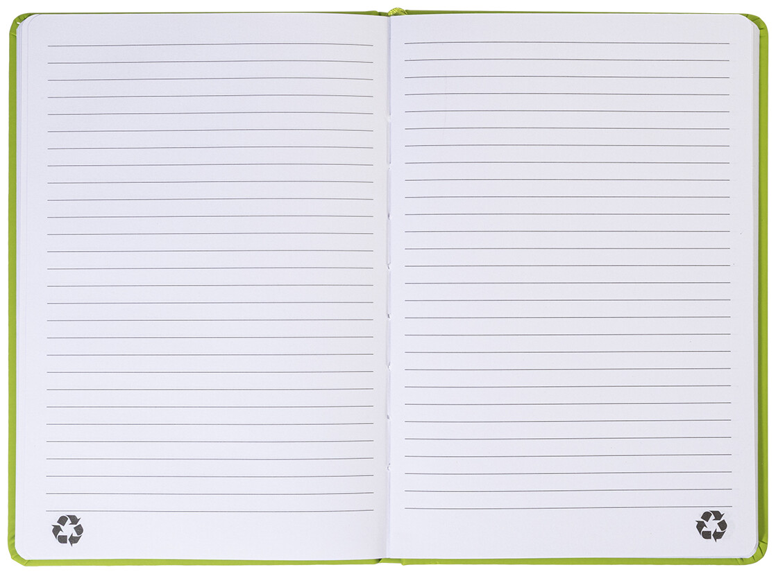 Blok potažený recyklovanou PU kůží se 100 linkovanými listy z recyklovaného papíru. Se záložkou v odpovídající barvě a gumičkou. Velikost A5.