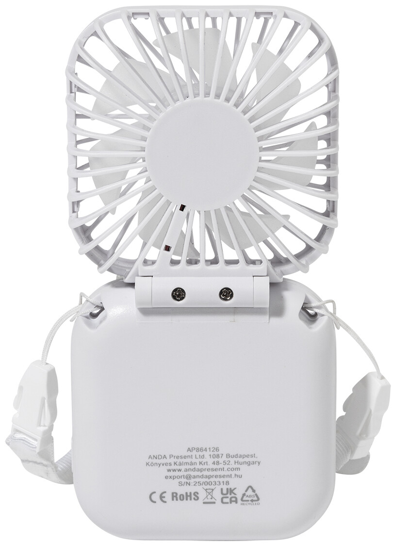 Elektrický ruční větráček z recyklovaného ABS plastu s poutkem na krk a vestavěnou dobíjecí baterií přes USB (500 mAh). S nastavitelným úhlem hlavy a 3 rychlostmi. Včetně USB kabelu pro nabíjení.