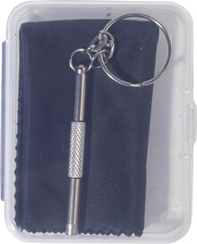 Kompaktní sada na opravu brýlí v průhledné PP krabičce. Včetně čisticího hadříku ze 100% RPET mikrovlákna (220 g/m2) a mini šroubováku s klíčenkou. Rozměr hadříku: 18×15 cm.