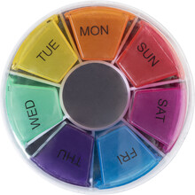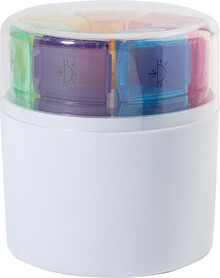 Sada týdenních krabiček na léky z recyklovaného ABS plastu se 7 denními krabičkami, každá se 4 přihrádkami pro různé denní doby. V kulatém stojanu s průhledným víkem.