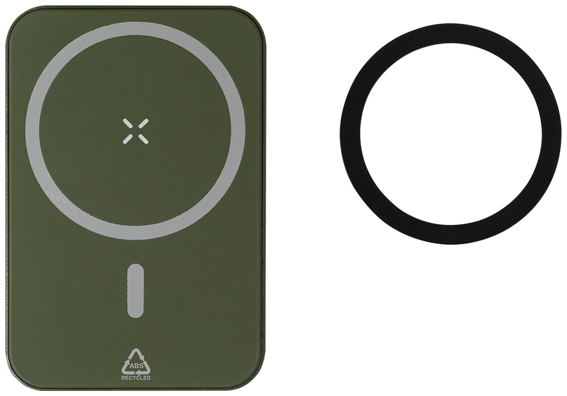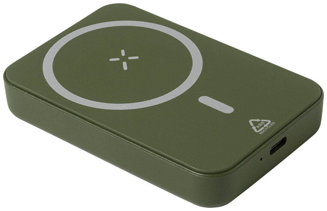 Power banka z recyklovaného ABS s 5000 mAh baterií a vestavěnou magnetickou bezdrátovou nabíječkou (5W). Se vstupem USB-C a portem pro nabíječku. Včetně samolepícího kovového kroužku pro použití magnetické funkce na jakémkoli bezdrátově nabíjecím zařízení. Kompatibilní s iPhone® 12 nebo novějším. Včetně USB nabíjecího kabelu.