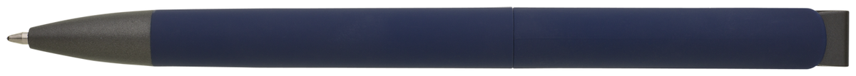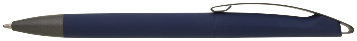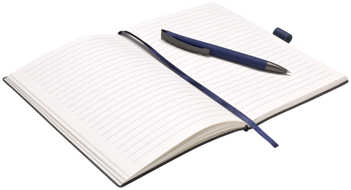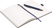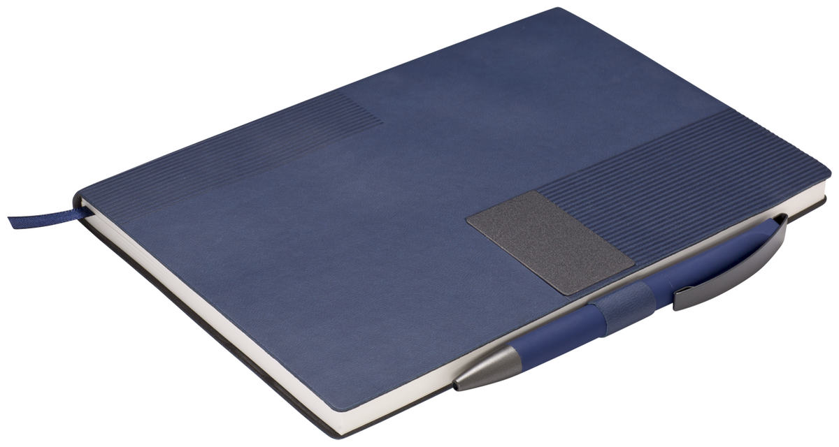 Elegantní zápisník A5 v PU deskách s 80 bílými linkovanými stranami a plastovou propiskou s pogumovaným povrchem a modře píšící náplní X20. Blok má uzavírací gumičku, poutko na propisku a textilní záložku v barvě desek.