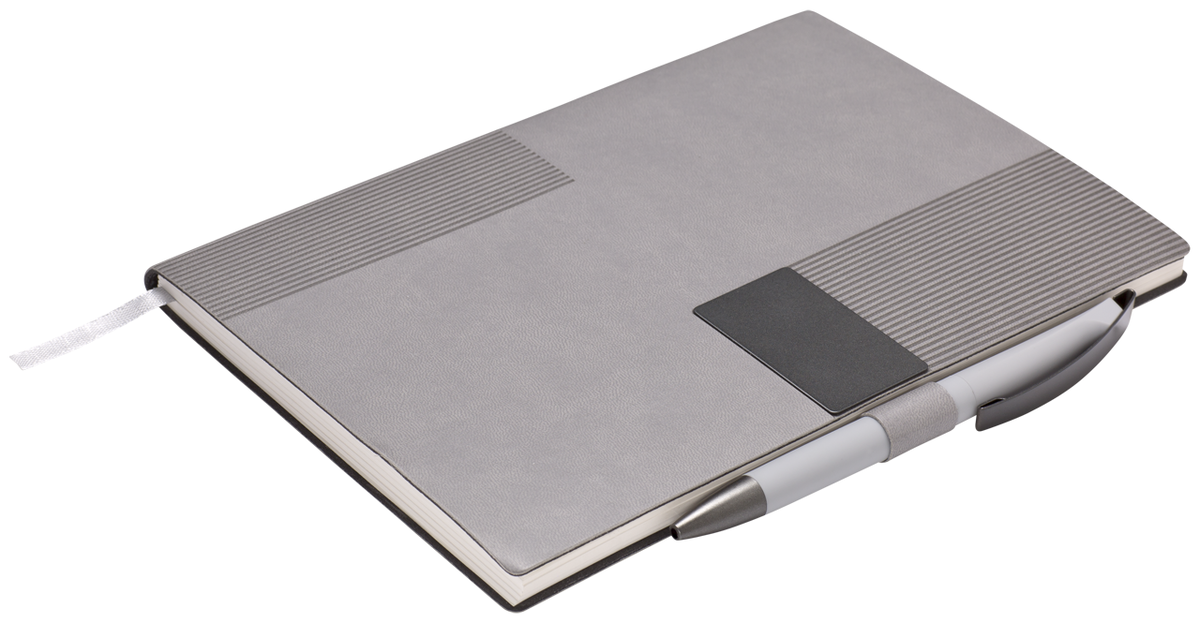 Elegantní zápisník A5 v PU deskách s 80 bílými linkovanými stranami a plastovou propiskou s pogumovaným povrchem a modře píšící náplní X20. Blok má uzavírací gumičku, poutko na propisku a textilní záložku v barvě desek.