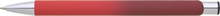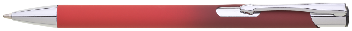 Hliníková propiska se stříbrnými doplňky a měkkým pogumovaným soft povrchem ve červeno–tmavě červeném přechodu. Náplň velkoobsahová, modře píšící.