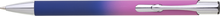 Hliníková propiska se stříbrnými doplňky a měkkým pogumovaným soft povrchem ve tmavě modro–růžovém přechodu. Náplň velkoobsahová, modře píšící.