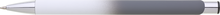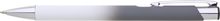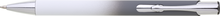 Hliníková propiska se stříbrnými doplňky a měkkým pogumovaným soft povrchem v bílo-šedém přechodu. Náplň velkoobsahová, modře píšící.