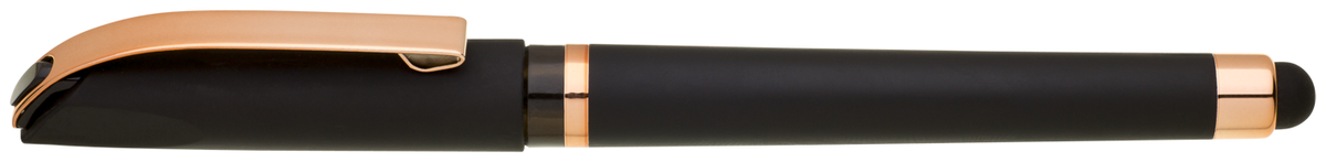 Gelová propiska s s víčkem a touch koncem, soft povrch a doplňky v růžovo-zlaté barvě. Náplň gelová velkokapacitní modře píšící.