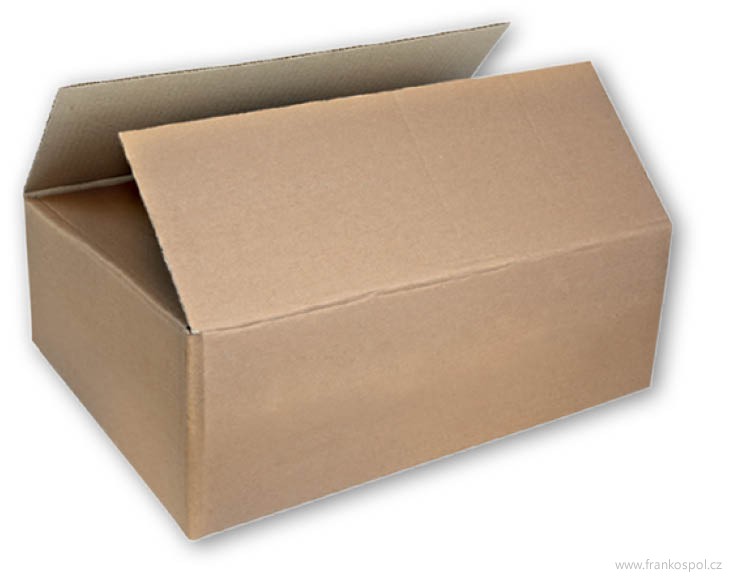 Hnědé krabice z vlnité lepenky, klopy se lepí páskou. Balení 25 ks. Rozměry: 428 x 304 x 224 mm.