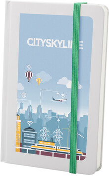 Poznámkový blok s bílými deskami, 80 čistými listy a barevnou gumičkou. Velikost A6.