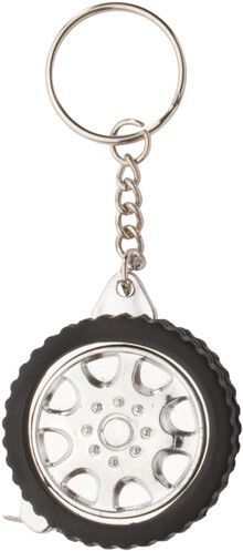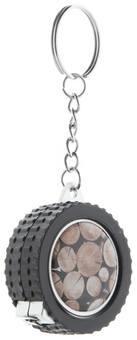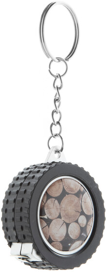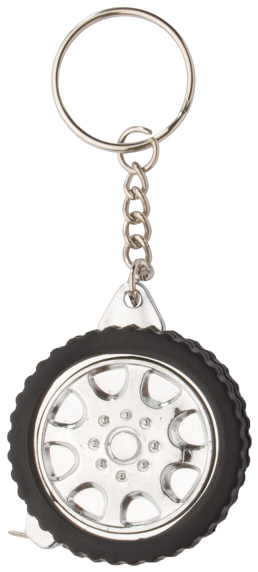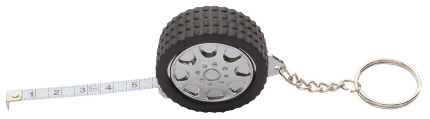 Přívěšek na klíče ve tvaru kola s metrem délky 1m, materiál guma a kov.