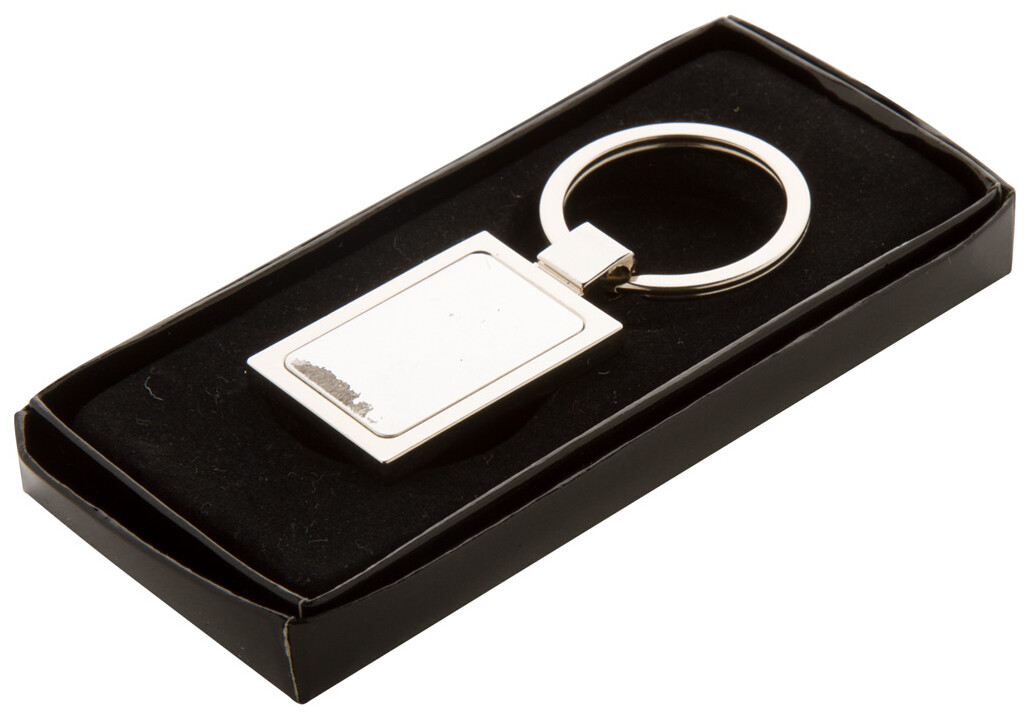 Kovový přívěšek na klíče v krabičce z černého kartonu.
