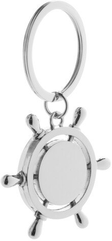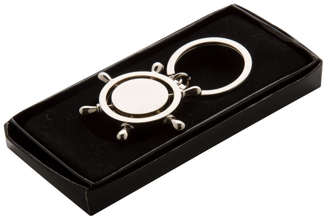 Kovový přívěšek na klíče ve tvaru kormidla, v černé dárkové krabičce.